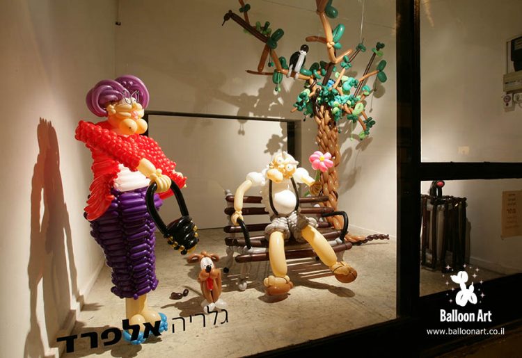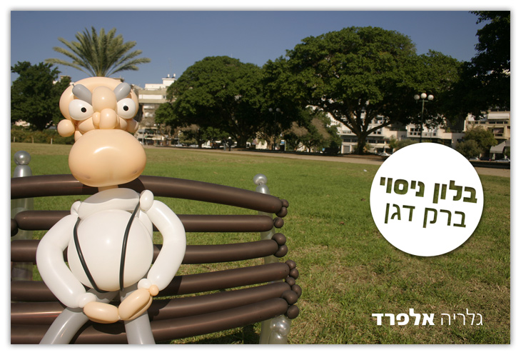 בנובמבר 2008 יצרתי את המיצב "בלון ניסוי" בגלריה אלפרד בתל אביב. המיצב היה עשוי ממאות בלונים בגדלים, צורות, וצבעים שונים והוא תיאר סצנה אורבנית יום יומית, שבמרכזה דמות של אדם זקן המחזר אחר אישה זקנה. היתה זו התערוכה הראשונה שהציגה פיסול בבלונים בגלריה לאמנות עכשווית בארץ.