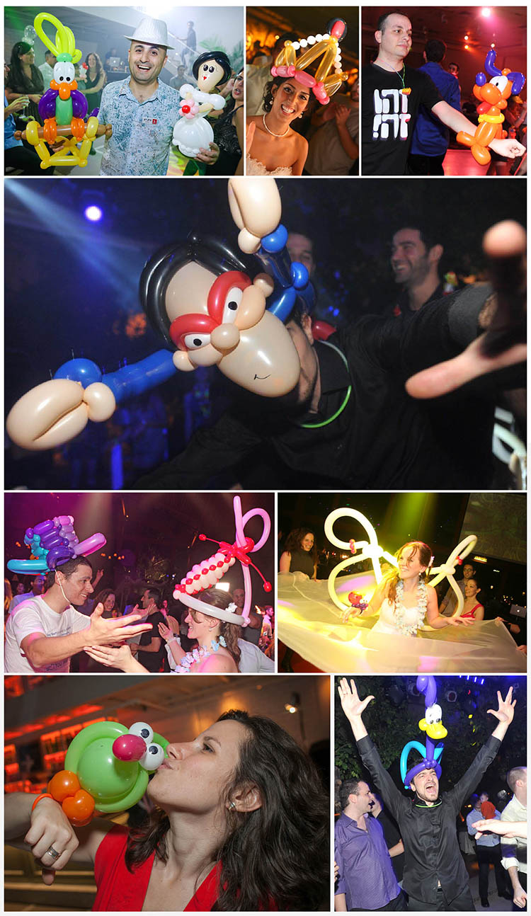תנו לאמנות בלונים עוצרת נשימה להשתלב בחתונה שלכם! כן, זה אפשרי ליצור בלונים אסטתיים, מיוחדים ומגוונים, שכולם רוצים להצטלם איתם! הדגש ביצירות שלי בחתונות הוא על כובעי בלונים ובלוני צורות שניתן ללבוש על הגוף: כובעים, צמידים מבלונים, כנפיים מבלונים, בלונים שמוצמדים לקשתות לשיער, בלונים ניתן ללבוש על הגב ועוד ועוד, זאת על מנת לאפשר לאורחים להפוך את רחבת הריקודים בחתונה לצבעונית ושמחה במיוחד. מדובר באמנות מהפנטת, ברמה בינלאומית, שמלהיבה ילדים ומבוגרים כאחד, והופכת את כולם לשמחים במיוחד (: